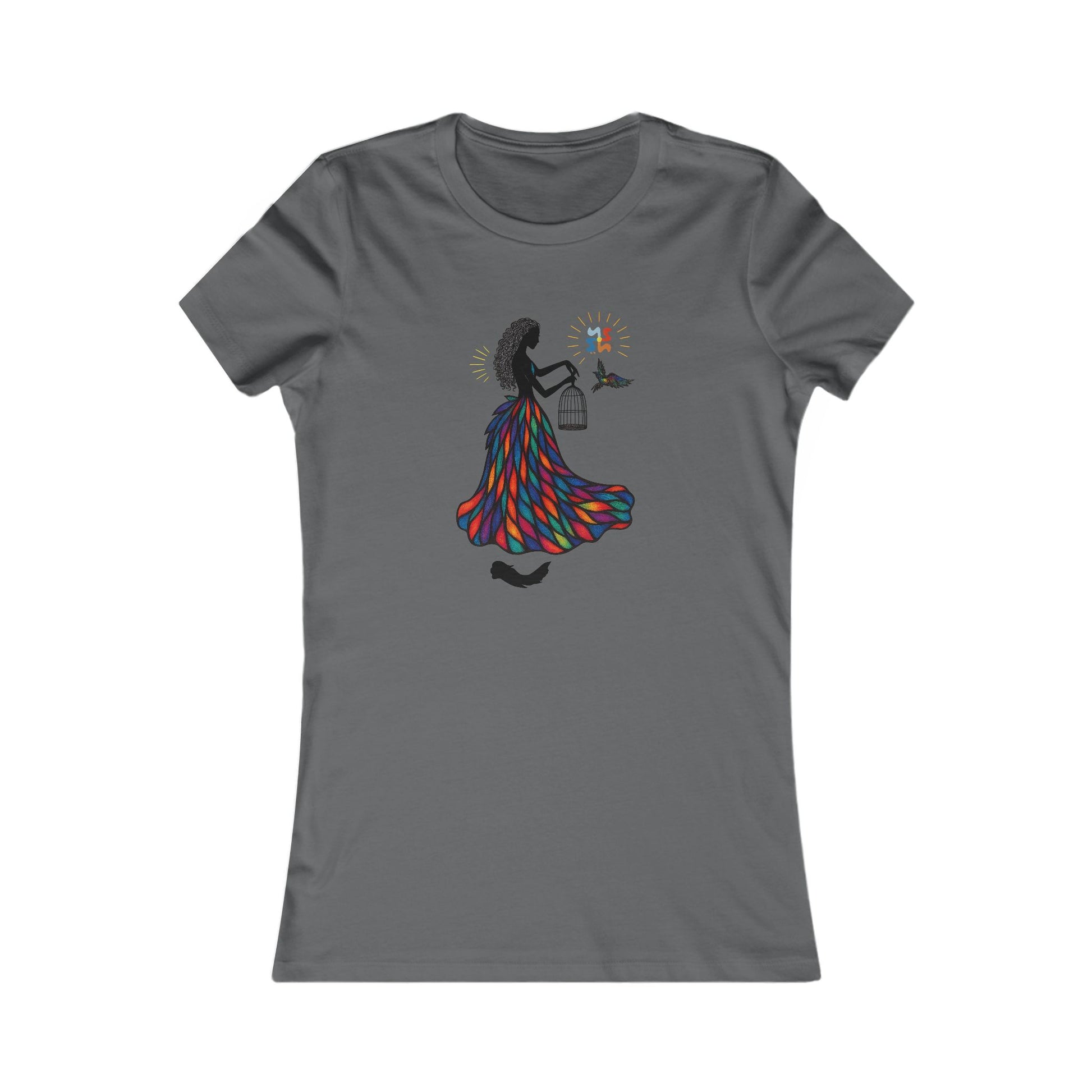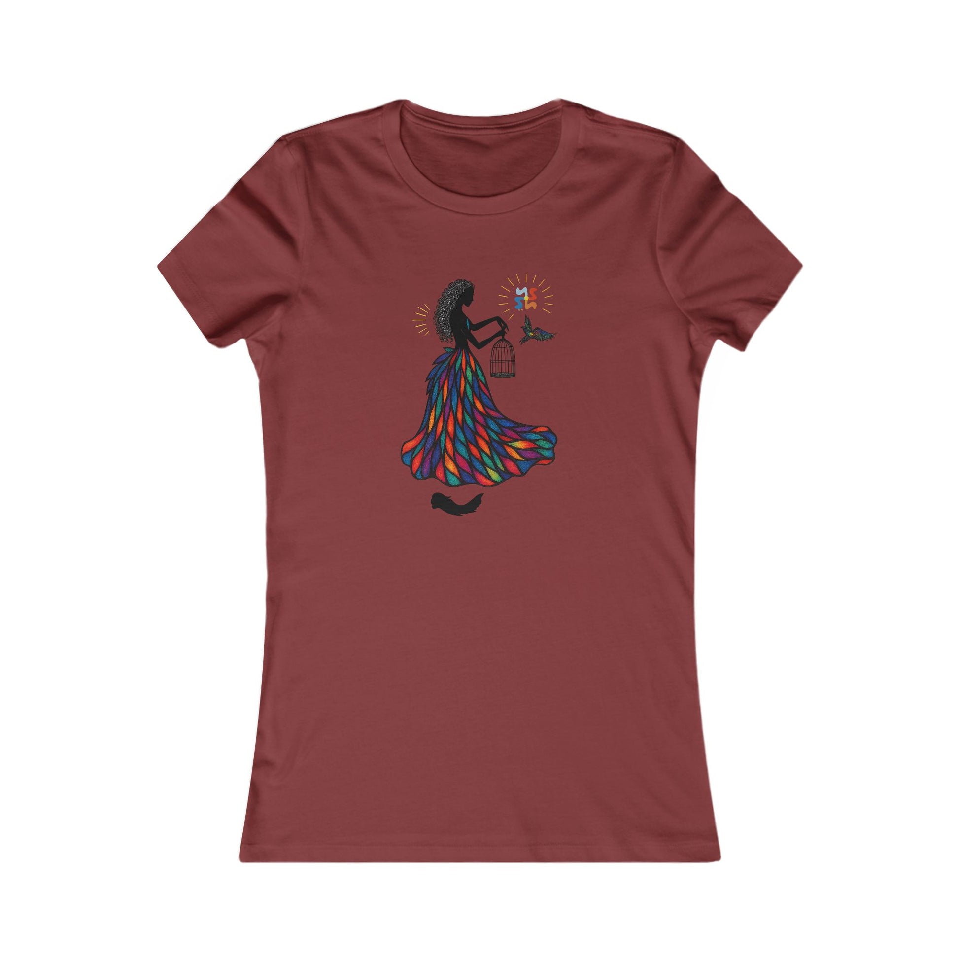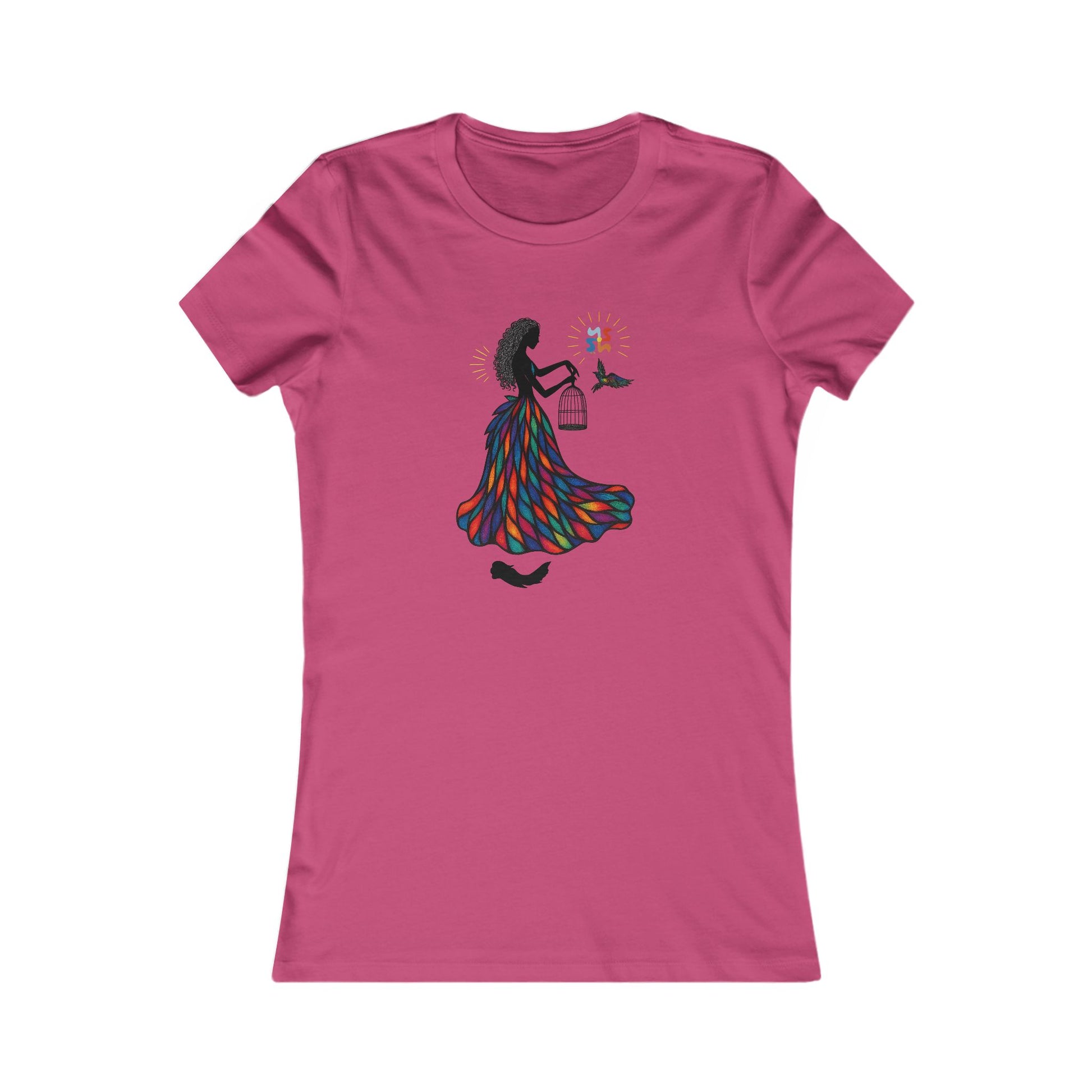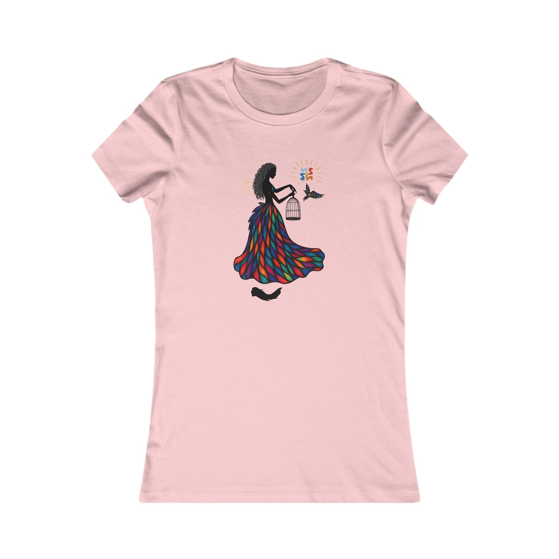 Grace, color, and liberation flow through every line of "She Who Sets Light Free"—a radiant tribute to inner power and divine release. This design features a silhouetted woman adorned in a vibrant stained-glass gown, gently opening a cage as a multi-colored bird takes flight. Above her, the Yoonaverse mark shines like the sun, casting rays of cosmic intention over the scene.