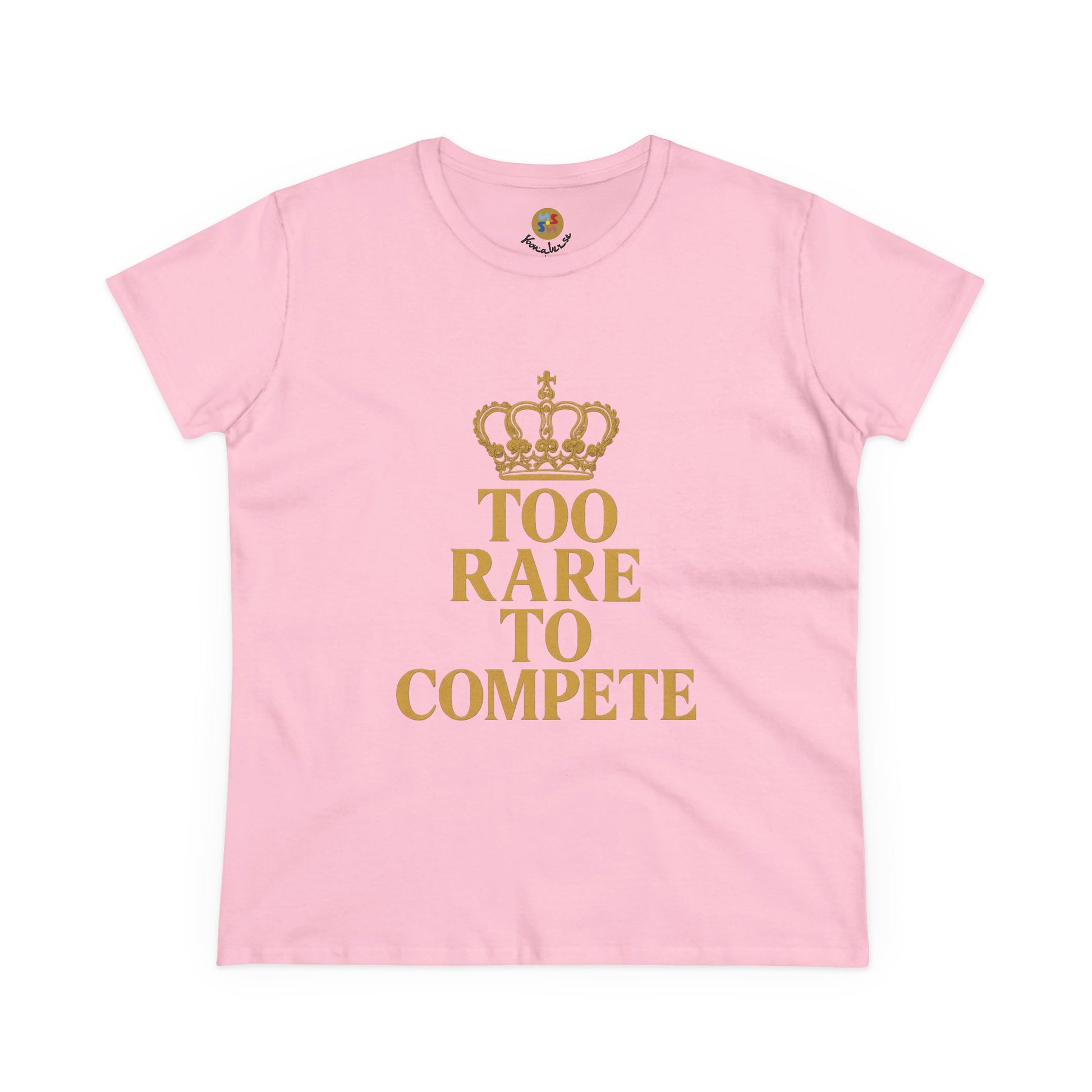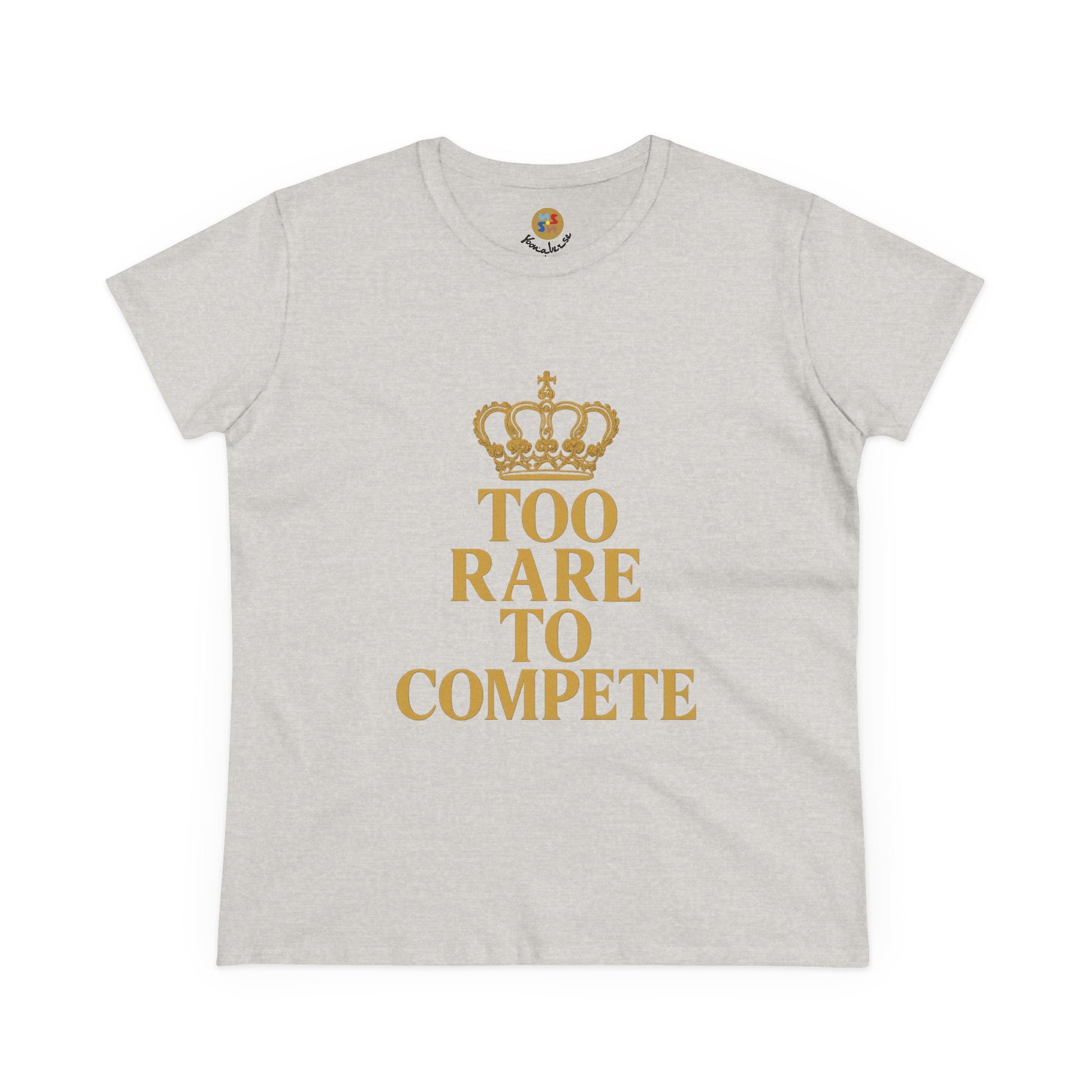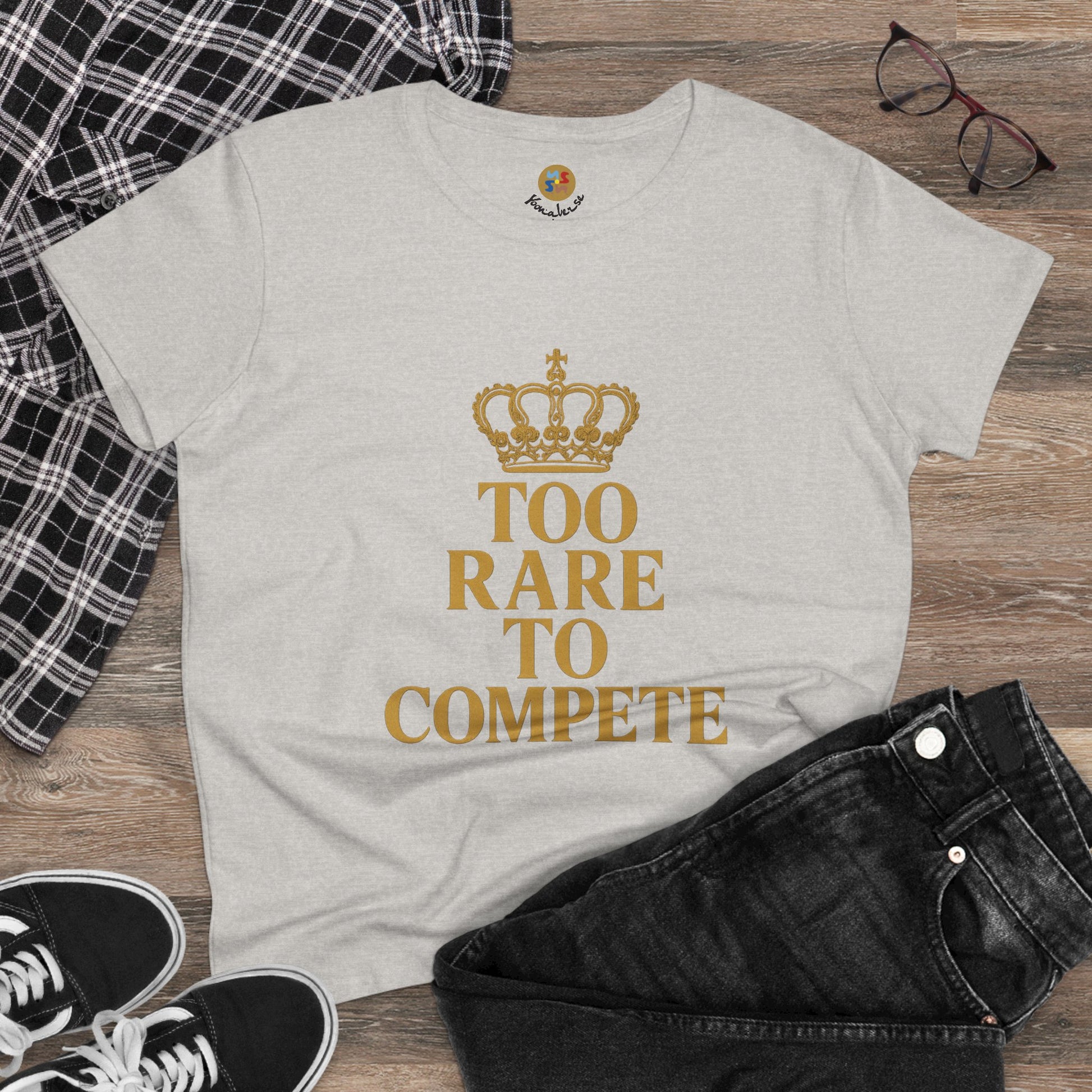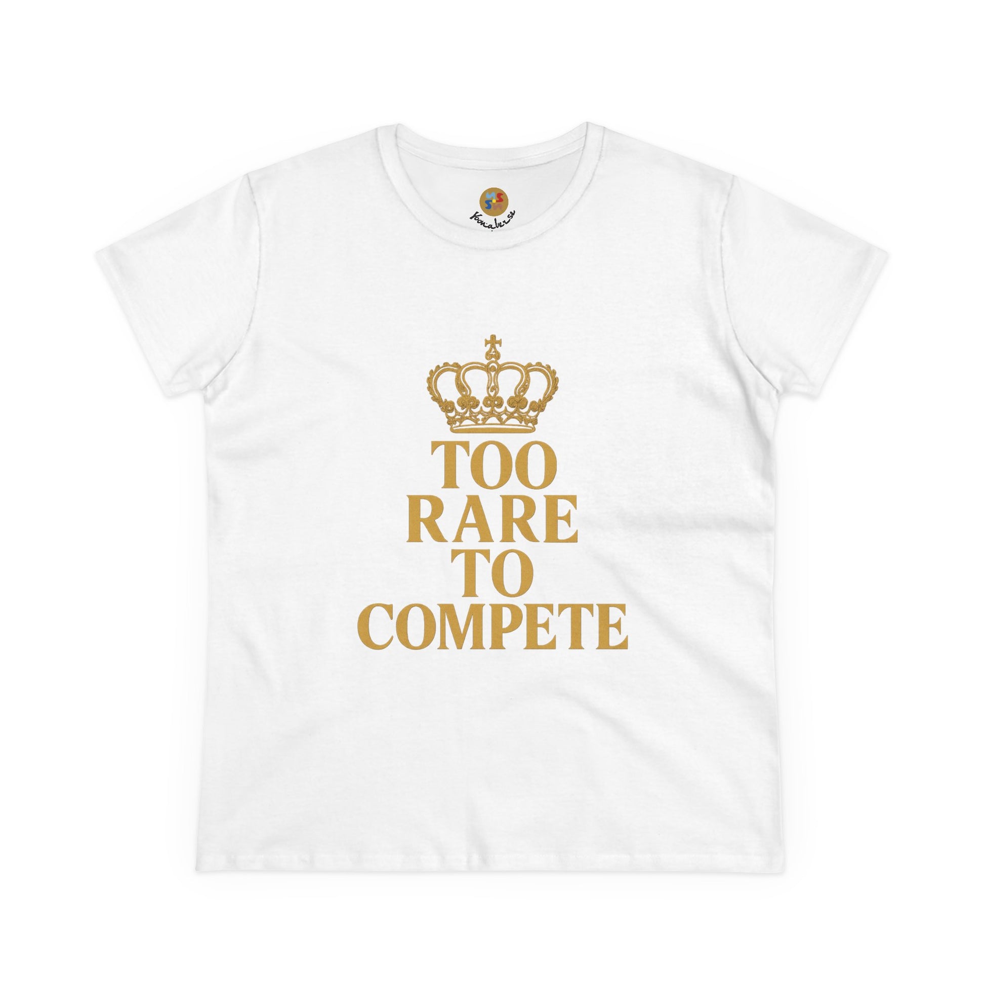 This TOO RARE TO COMPETE tee features a rich gold-accented design for women who know their worth and never seek comparison. Crafted for comfort with a semi-fitted silhouette, this midweight cotton tee brings together modern streetwear and quiet luxury. Bold in essence. Timeless in tone
