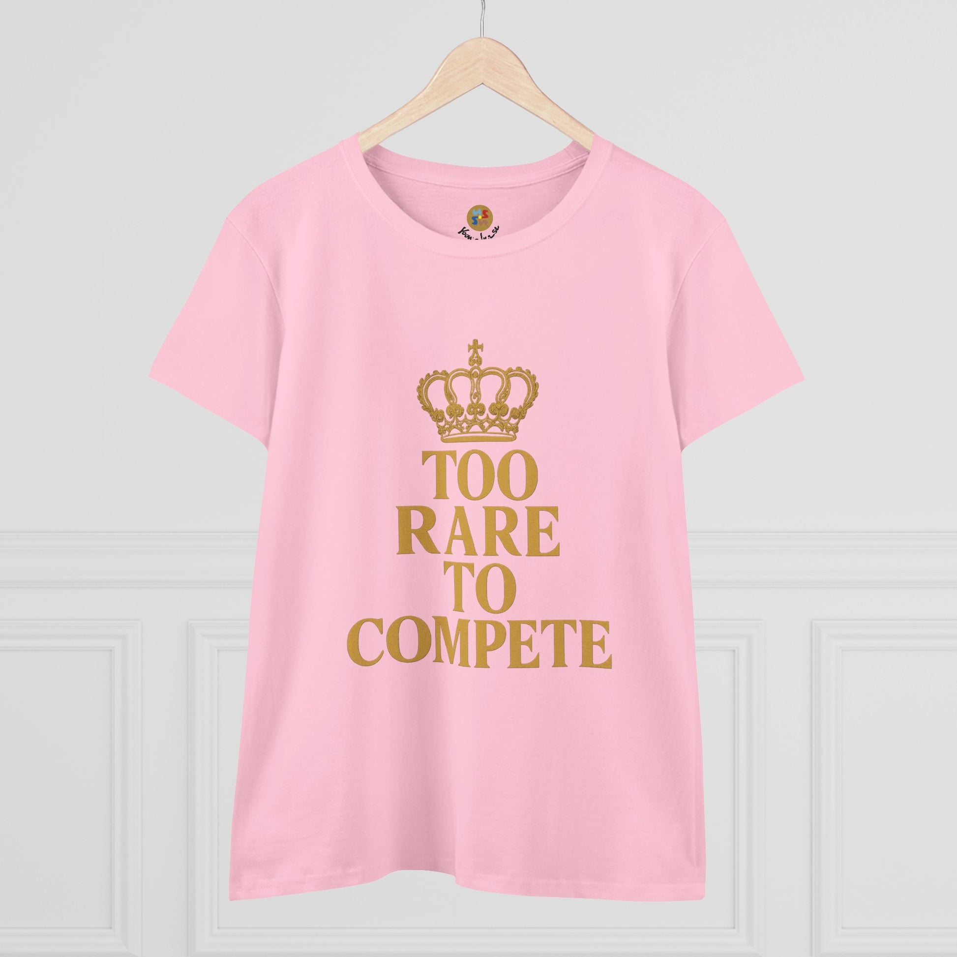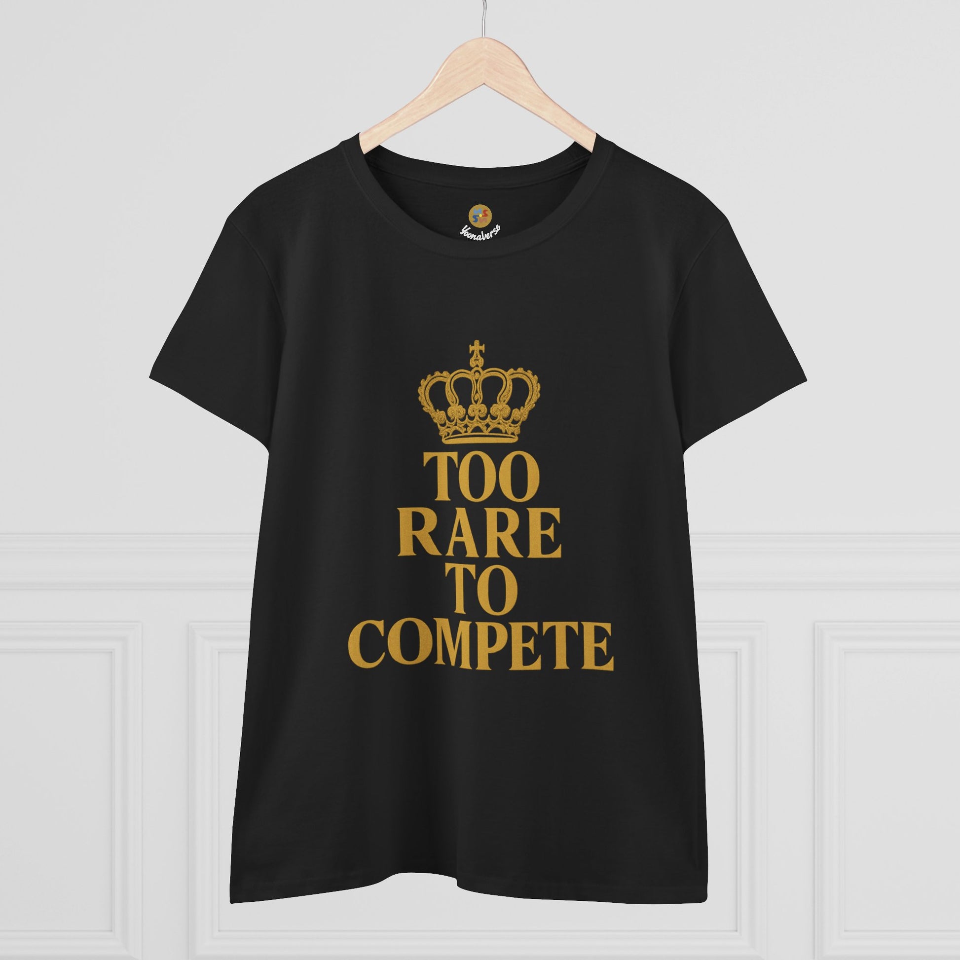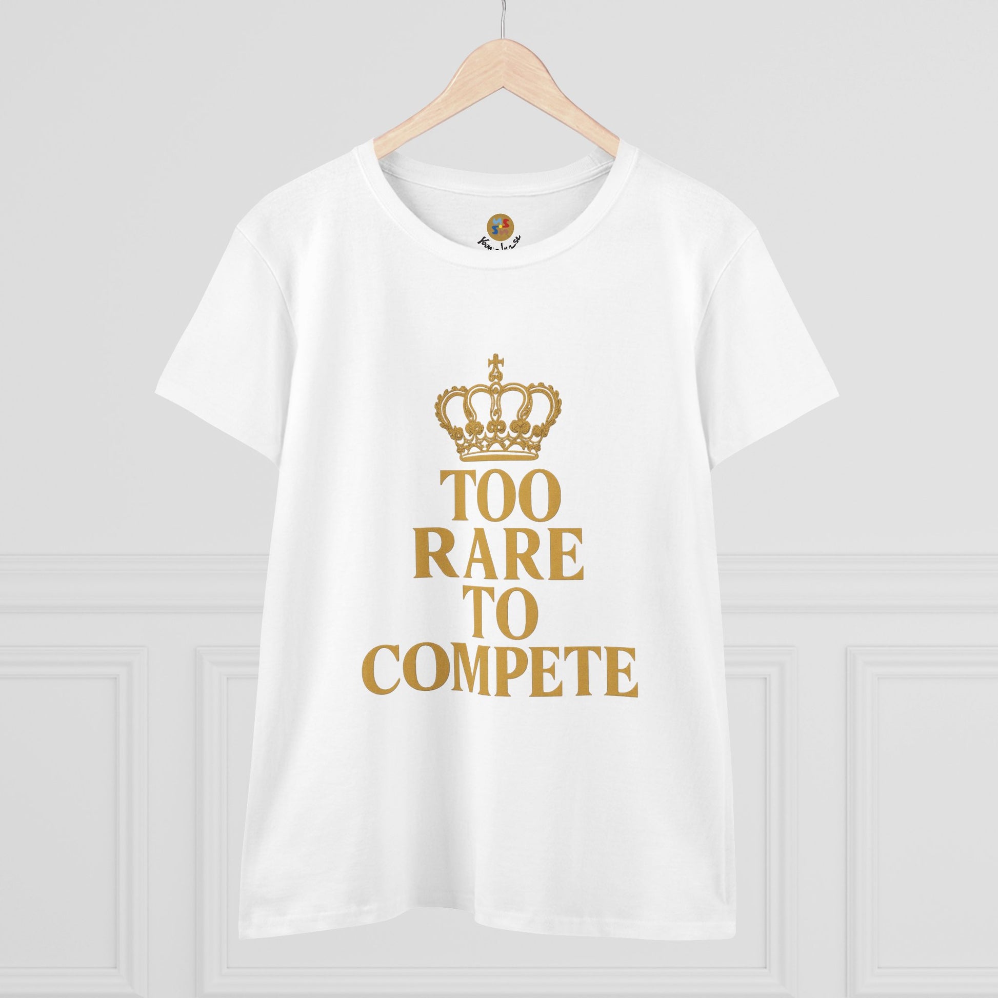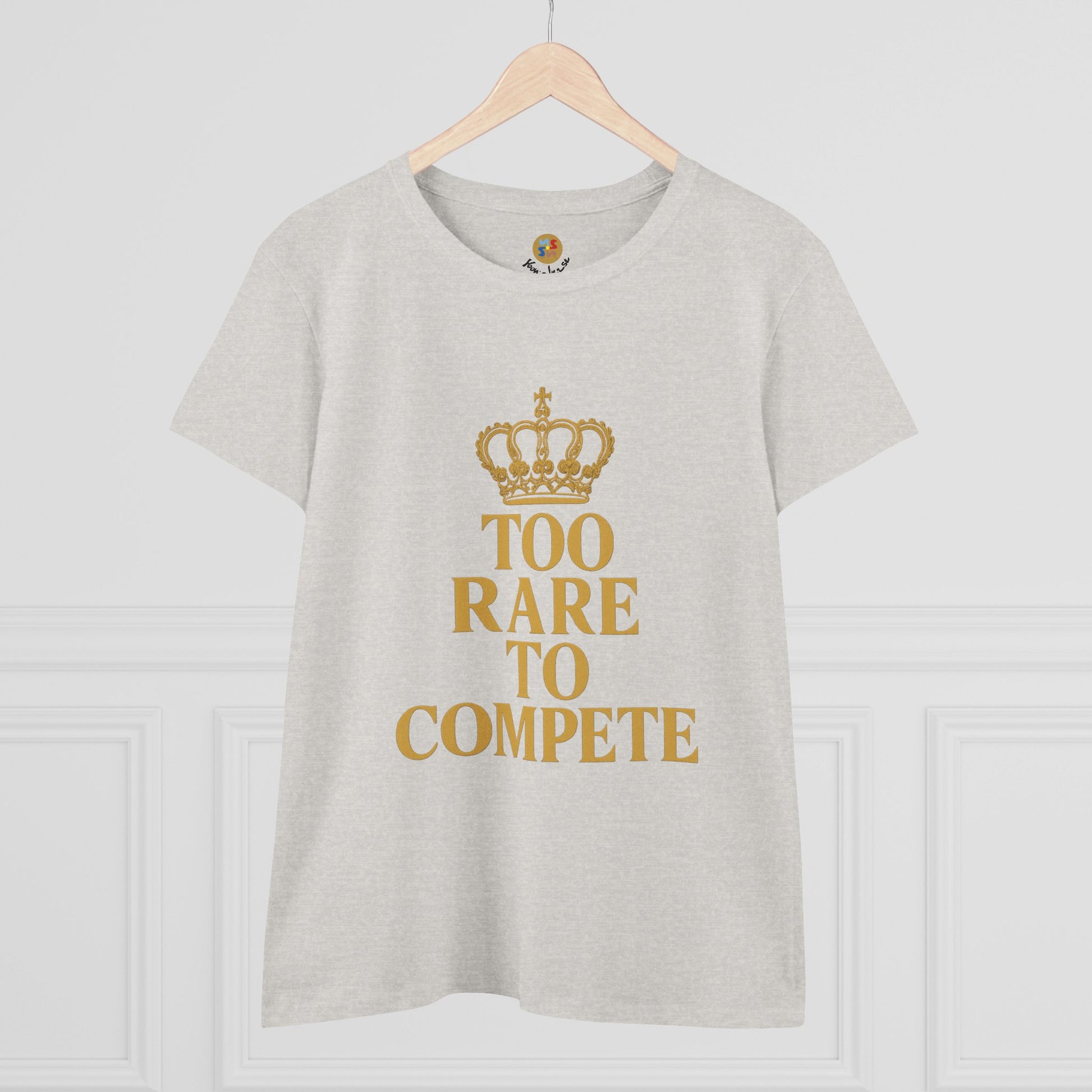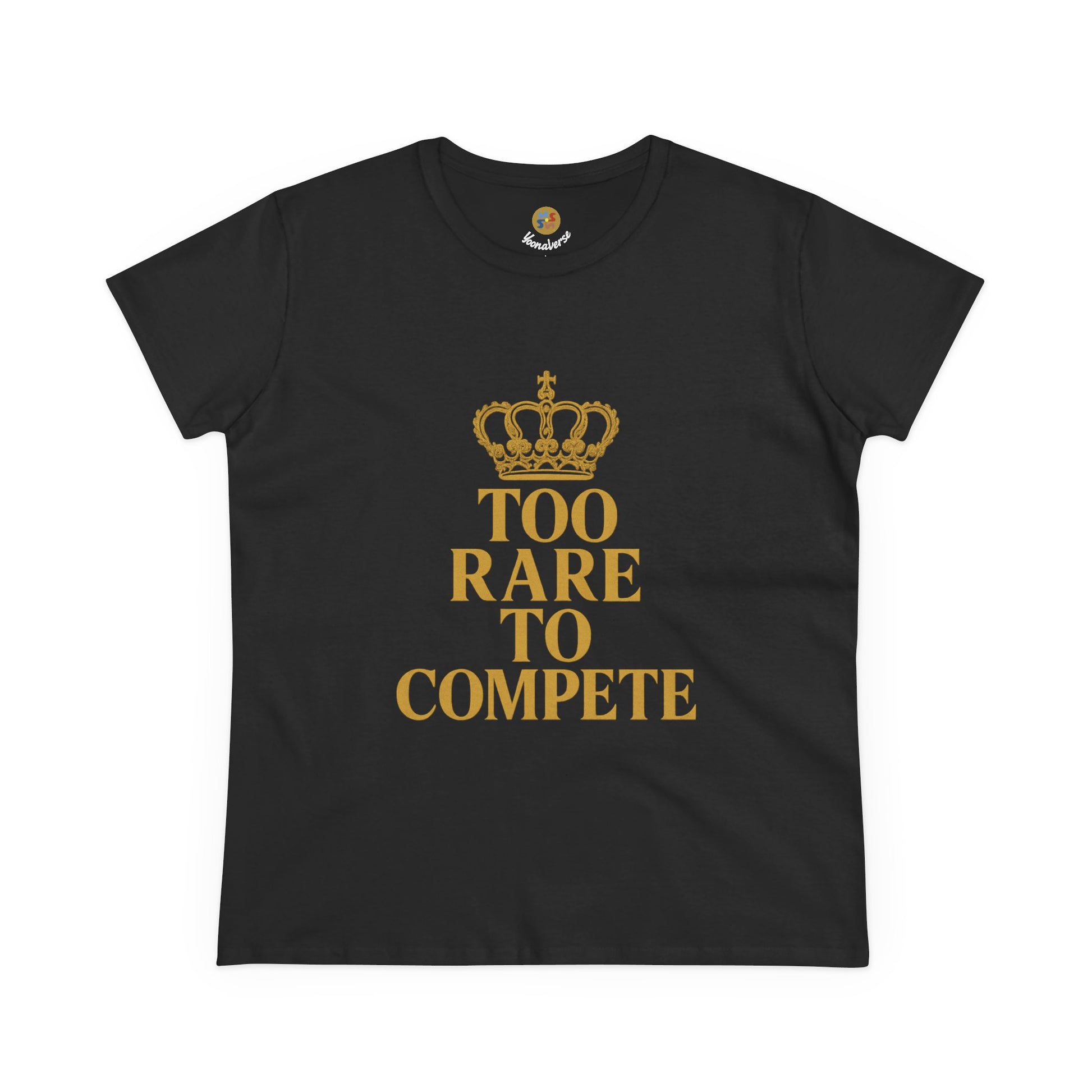 This TOO RARE TO COMPETE tee features a rich gold-accented design for women who know their worth and never seek comparison. Crafted for comfort with a semi-fitted silhouette, this midweight cotton tee brings together modern streetwear and quiet luxury. Bold in essence. Timeless in tone