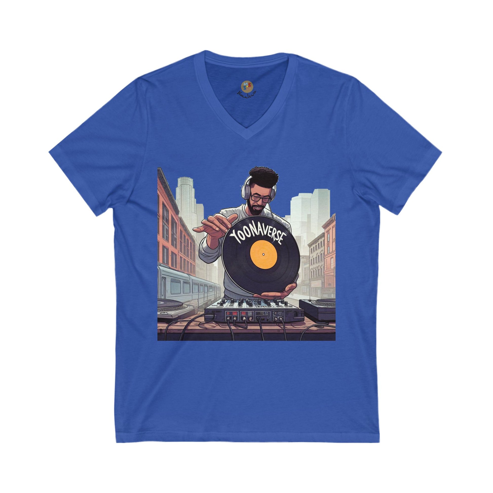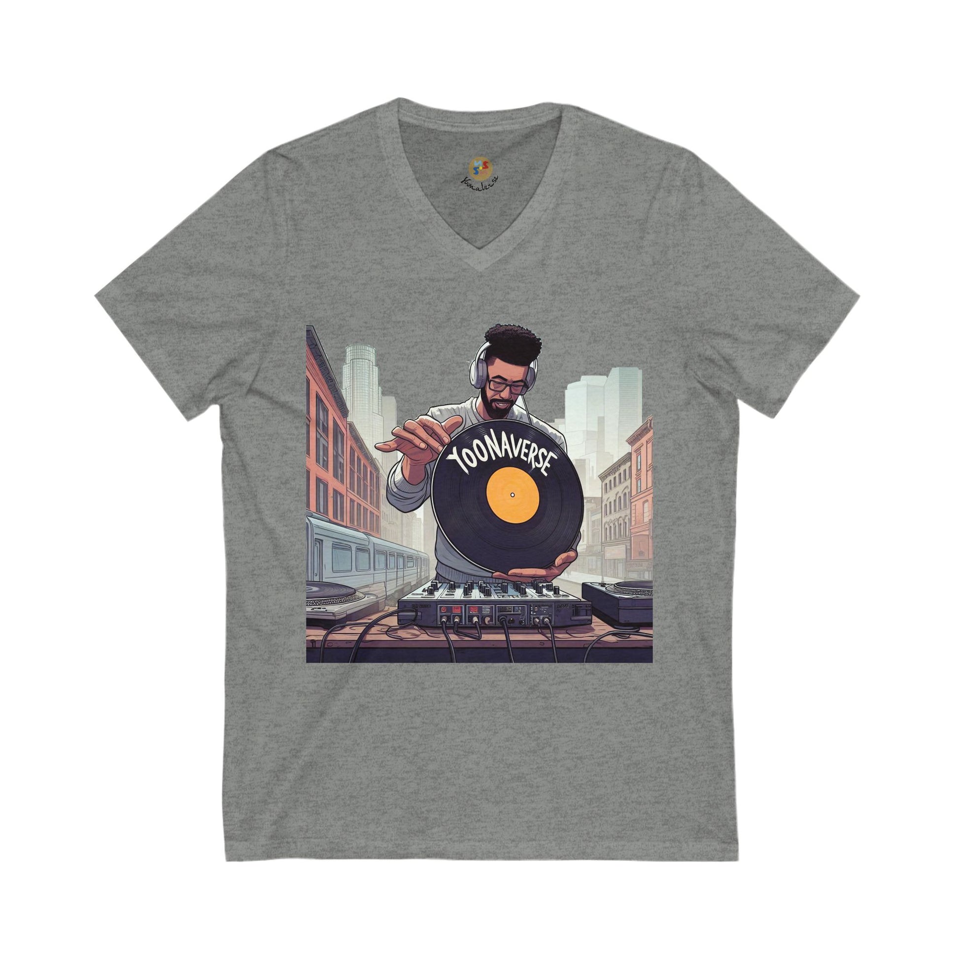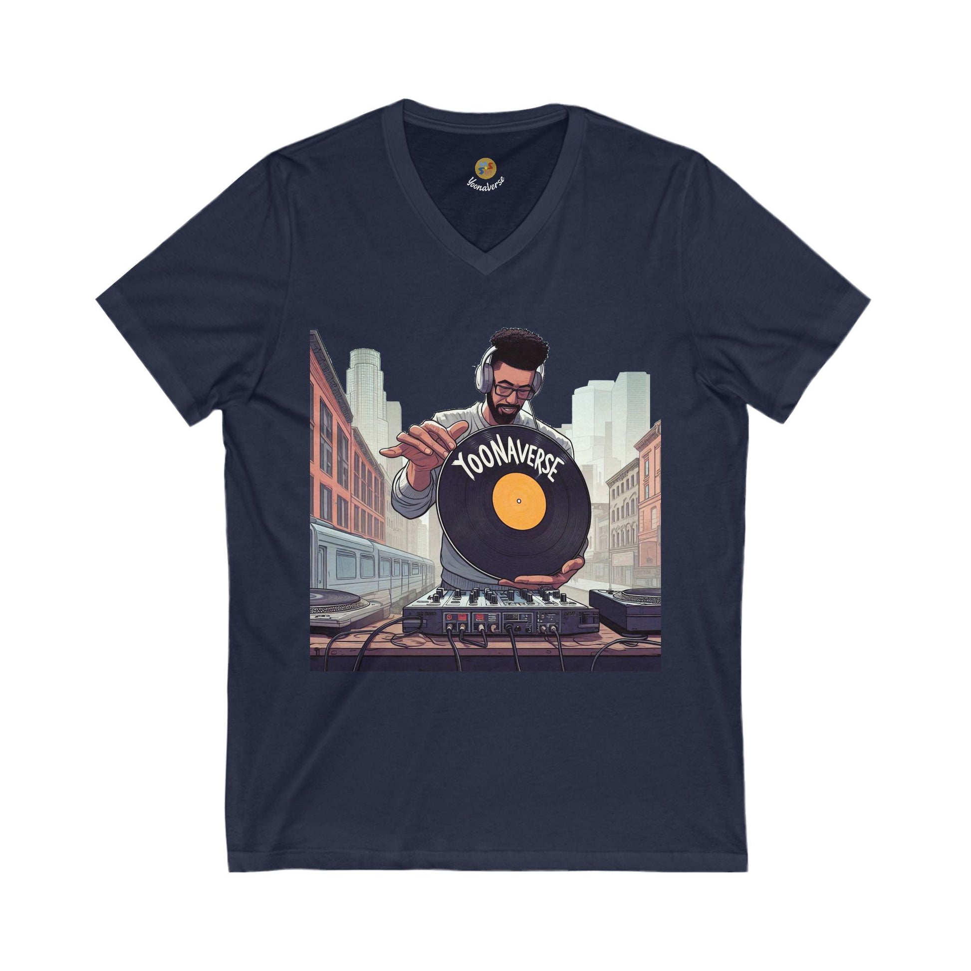 Bring beats to the streets with the “City Spin” DJ Tee from Yoonaverse. This bold V-neck features a DJ mid-spin, setting the vibe in an urban backdrop. Whether you're mixing records or mixing energy in the crowd, this shirt is made for creators who turn motion into momentum.